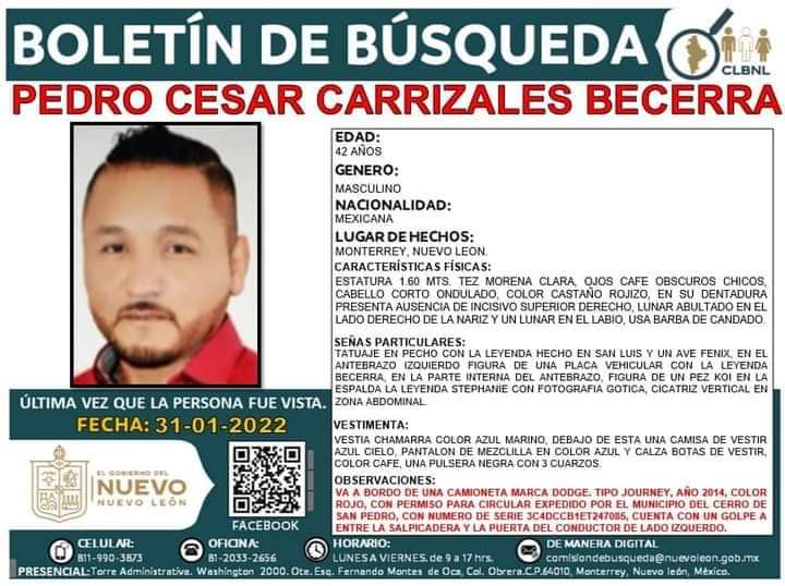 En un comunicado de prensa, la Fiscalía General del Estado de San Luis Potosí (FGESLP) informó que la carpeta de investigación sobre la no localización de Pedro César Carrizales Becerra fue derivada a la Fiscalía General de Justicia de Nuevo León (FGJNL).