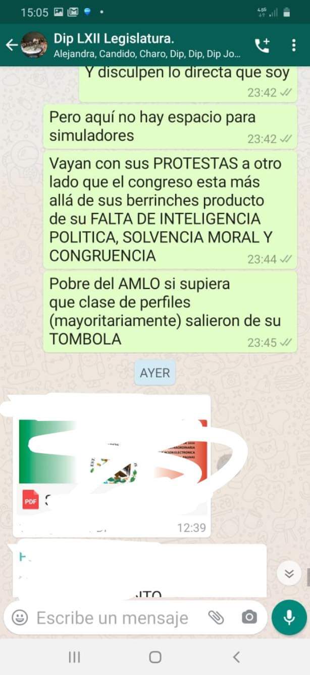 Con motivo de la filtración de conversaciones que se generaron en un chat entre diputados y diputadas integrantes de esta legislatura, es de todo mi interés precisar que; aunque pensé que era una conversación privada entre legisladores, en nada de lo dicho me retracto, pues sigo pensando firmemente que calificar de “agandalle” un acuerdo que se logró con votos es injusto, y lo es más, cuando es el congreso el que sufre las consecuencias con shows y manifestaciones que no nos llevan a ningún lado.