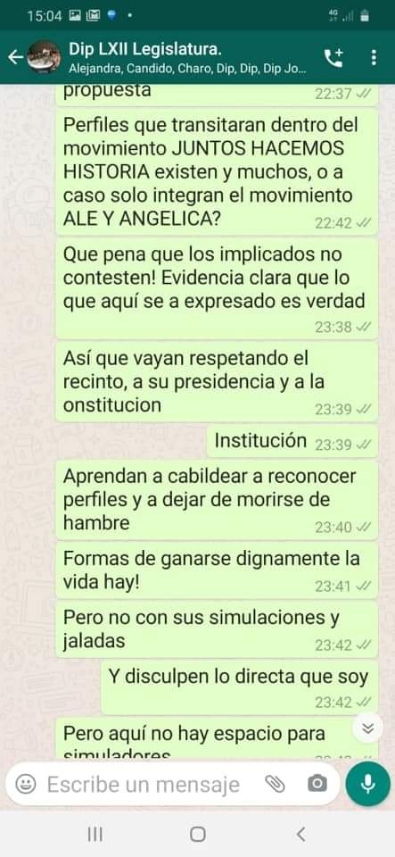 Como prueba fehaciente de que digo lo que pienso y sostengo lo que digo, yo misma comparto aquí con uds capturas de pantalla de lo que puse en el chat, no me asusta ni me espanta que se filtren conversaciones y que exista quien las quiera utilizar como golpeteo, omito las respuestas de mis compañeros porque será asunto de cada quien dar a conocer su versión pero reitero que mi primordial interés es buscar lo mejor para el congreso.